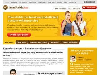 Essayforme.com has been providing students at different academic levels with best essay services for a long time. It is a popular service among students as it has exhibited the ability to solve their essay problems. Essay For Me takes professionalism seriously and ensures that students get the best essay service. It takes advantage of its experience to continuously improve its services. Essay For Me thoroughly checks completed essays and ensures that they are written from scratch so that students hand over original work. Essayforme.com receives a high number of orders but it is well prepared to handle all of them competently by hiring a large team of over 1500 writers. It hires highly qualified native English writers who hold Masters or PhD degrees and experience of at least 2 years. Essay For Me is among the essay writing services known to complete urgent orders within a few hours of receiving the order. Urgent orders are also subjected to the same quality standard as others. Essayforme.com support team attends to queries 24/7 without any breaks. Customer support department is reached through toll free number or Live Chat. Although essayforme.com is a popular service it charges reasonable prices to students so that they have access to highly qualified writers. Prices begin at just $10.95 for school essay with a deadline of 10m days. The most expensive paper is a PhD essay with a 3 hour turnaround at $59.95. Customers also get a 15% discount hence they cannot complain of an essayforme.com rip off. Essay for Me ensures that all orders are plagiarism free. It also ensures that they all essays are delivered on time. All essays are completed to the highest possible standard. Customers are entitled to free revision in case they feel that some parts need to be amended. Essayforme.com is legitimate service and there are suggestions of its involvement in fraud.